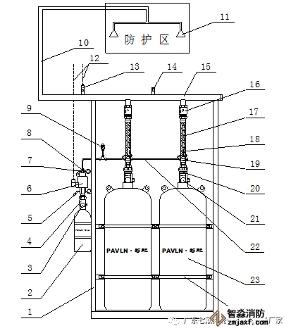 當(dāng)防護(hù)區(qū)發(fā)生火災(zāi)時,火災(zāi)報(bào)警滅火控制器發(fā)出指令打開驅(qū)動氣體瓶組,釋放驅(qū)動氣體。驅(qū)動氣體通過驅(qū)動氣體流通管路,打開滅火劑瓶組容器閥,釋放滅火劑。滅火劑經(jīng)金屬軟管、單向閥(滅火劑管路)、集流管、滅火劑輸送管道、噴嘴向防護(hù)區(qū)噴放,實(shí)施滅火。