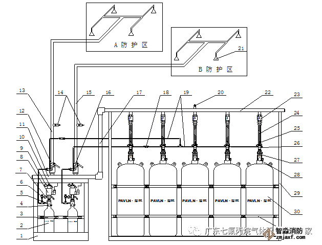 組合分配系統(tǒng)適用于兩個以上的防護(hù)區(qū)保護(hù),它的特點(diǎn)是每個防護(hù)區(qū)均設(shè)置自己的驅(qū)動氣體瓶組和選擇閥,而貯存滅火劑的瓶組是共用的(按最大的滅火劑使用量計(jì)算),為多區(qū)組合保護(hù),減少了一次性投資。